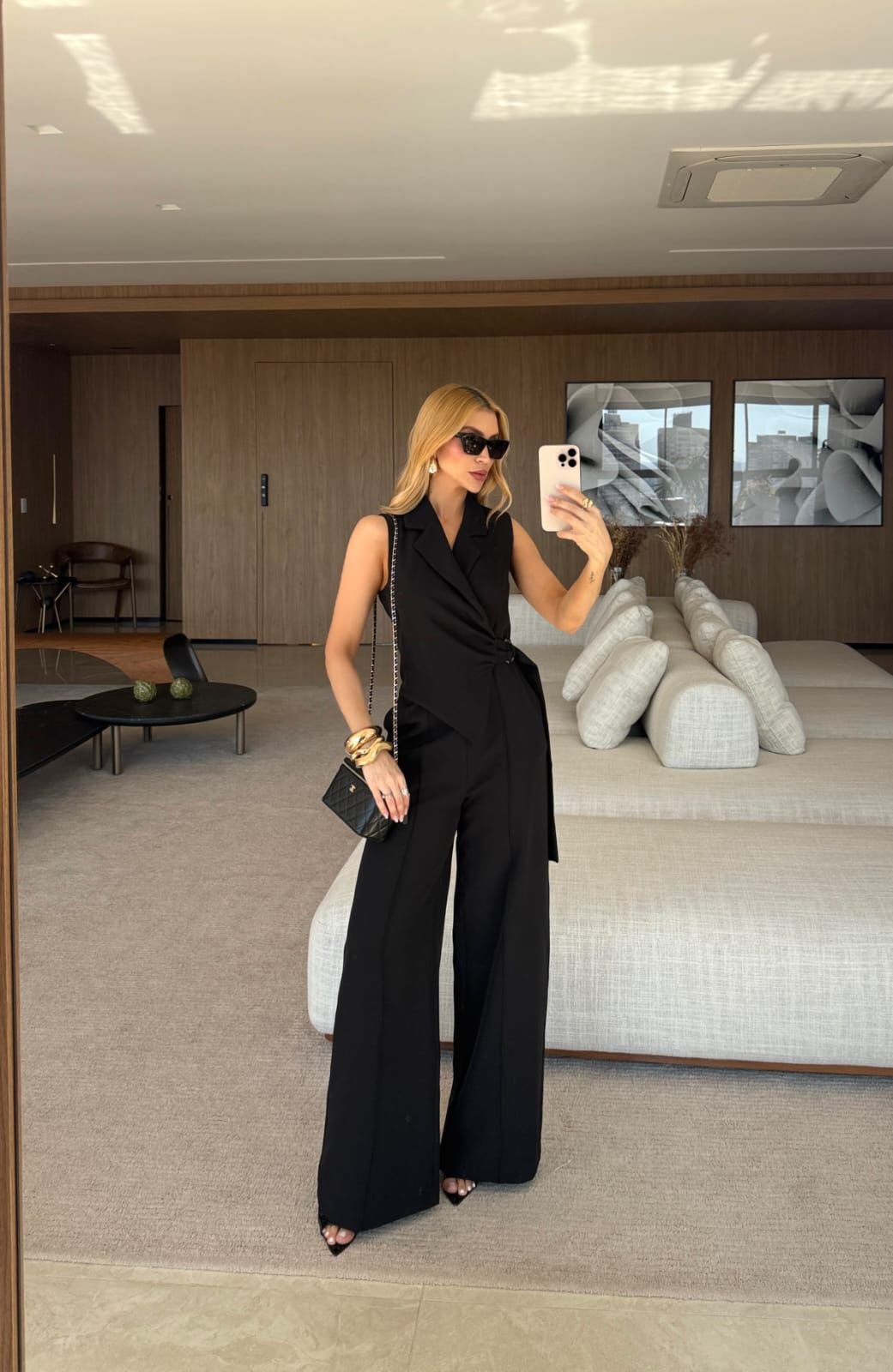 Conjunto Alfaiataria Preto ✨Elegância minimalista em cada detalhe. O Macacão sem mangas, com corte estruturado, modelo pantalona fluida, traduz sofisticação e versatilidade, perfeito para ocasiões que pedem presença marcante e estilo atemporal.